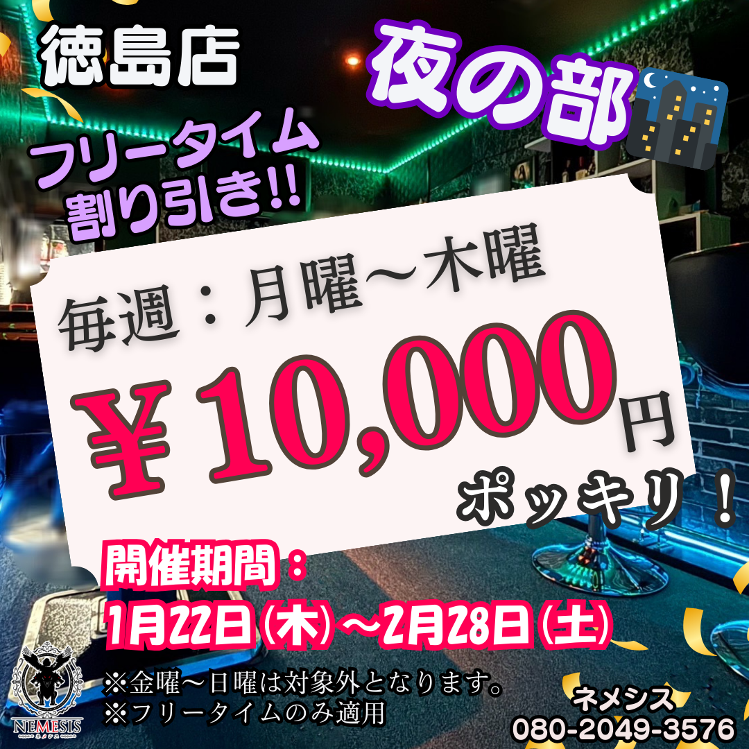 ★リピーター単独女性限定★ 💰駐車場代 返金キャンペーン💰 2度目以降の単独女性の方、 前回の駐車場レシートご持参で 駐車場代金を返金いたします🎁💕 ⚠️レシートは半年以内に限ります ⚠️カップル様でのご利用は不可 ぜひお得なキャンペーンを ご利用ください🤭💖︎ 皆様のご予約・ご来店を 心よりお待ちしております🌟 ☎️ 080-2049-3576 徳島店ハプバーの公式HPはコチラ! http://nemesis-t.bar-adoration.com