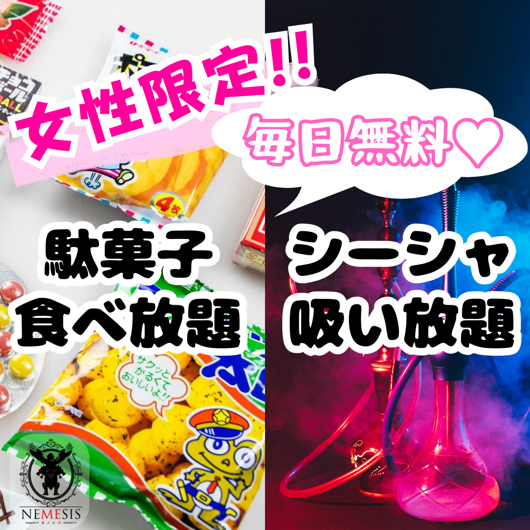 🌸 女性限定サービス 毎日開催 🌸 当店では、女性(女性に見える方)のお客様限定で ✨毎日お得に楽しめるサービス✨をご用意しています❣ 【🍭駄菓子食べ放題🍭】 懐かしいお菓子をつまみながら、みんなでワイワイ🎶 【💨シーシャ吸い放題💨】 気分に合わせてフレーバーを選んで、ゆったりリラックス🌿 時間の空いた時間に気軽に集まれる、居心地のいい空間をご提供します💕 ちょっと特別な夜を過ごしに、今すぐネメシス徳島店へGO✨